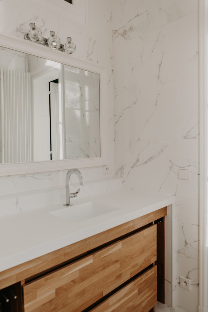 Attachés au patrimoine architectural, il n'était pas envisageable pour nous de détruire le caché du bien, nous avons donc imaginé tout un projet permettant de jouer entre douceur moderne et classique revisité.